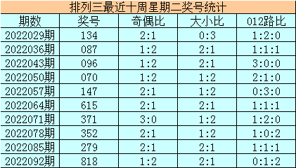 排列三十周星期二分别开出奖号:818、279、352、371、615、147、070、096、087、134,其中号码奇偶比为17:13,奇偶号码出现比例相当;号码大小比为14:16,大小号码基本持平;号码012路比为11:12:7,2路号码走冷。