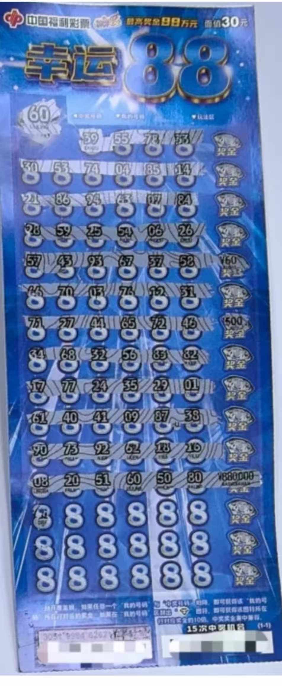 "我刮彩从不着急,就喜欢和老伴一起慢慢享受这个过程。"胡女士笑着回忆中奖当天的情景。那天她和闺蜜在站点各买了2张"幸运88",回家后像往常一样与老伴分享。当刮开序号"60"对应的第十二排时,赫然出现了最高奖金88万元!"我俩反复核对了好几遍,确认不是眼花",老两口激动得整夜未眠。