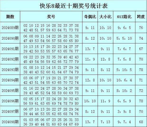 福彩快乐8第2024098期开奖回顾:01 03 05 06 07 23 25 26 31 33 36 39 40 44 51 60 63 64 67 69,其中奖号奇偶比开出13:7,大小比开出7:13,012路比开出9:7:4,和值为693,跨度为68。