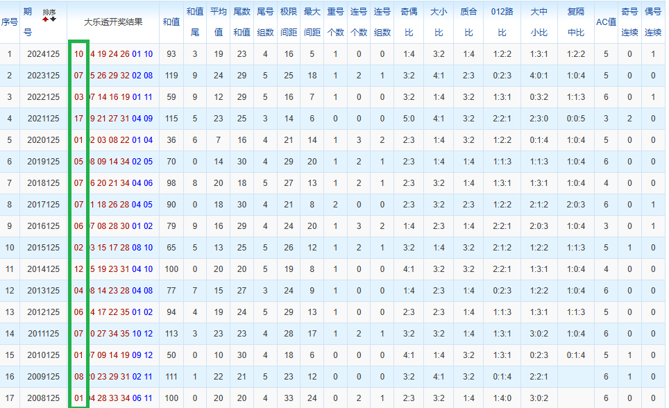 通过观察,我发现往年同期的开奖数据与本期号码之间存在显著关联。具体来说,在前区号码中,从第一位至第五位,通常会有约三个位置上的数字与往年同期相同位置的号码一致;而后区号码中,也有多期开奖结果直接包含了往年同期的数字。因此,我们可以借助往年同期各位置上的号码,作为分析本期开奖情况的重要依据。在此基础上,还可结合往年同期的其他相关条件,进行综合性的号码组合推荐。