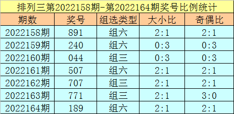上期回顾:排列三第2022164期出现奖号189。开出组六,奇偶比2:1,012路比1:1:1,大小比2:1,和值18,跨度8。