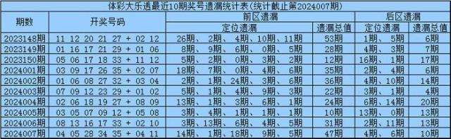 体彩大乐透第2024007期开奖回顾:前区奖号:04、05、28、34、35,后区奖号04、11,前区前各位遗漏:14期、1期、18期、9期、5期,遗漏总值47期,后区各位遗漏4期和6,遗漏总值10期。