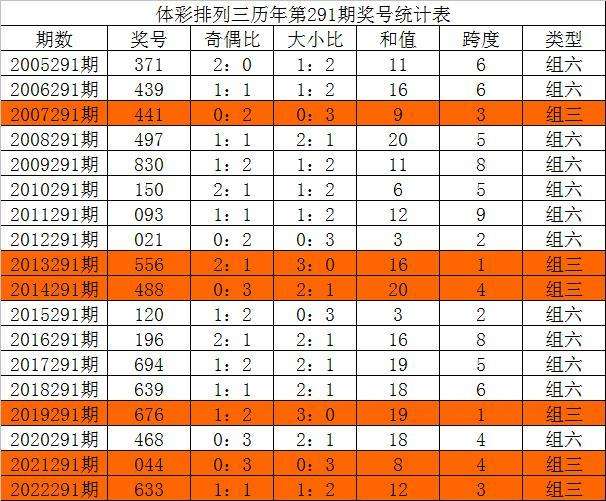 在历年排列三第291期开奖中:组三号码出现6次,组六号码出现12次。组三、组六号码出现比例持平,本期奖号形态关注:组六号码。