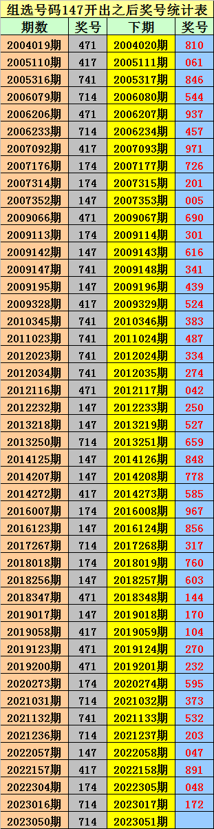排列三组选147出现之后下期分别开出:810、061、846、544、937、457、971、726、201、005、690、301、616、341、439、524、383、487、334、274、042、250、527、659、848、778、585、967、856、317、760、603、144、170、104、270、232、595、373、532、203、047、891、048、172。