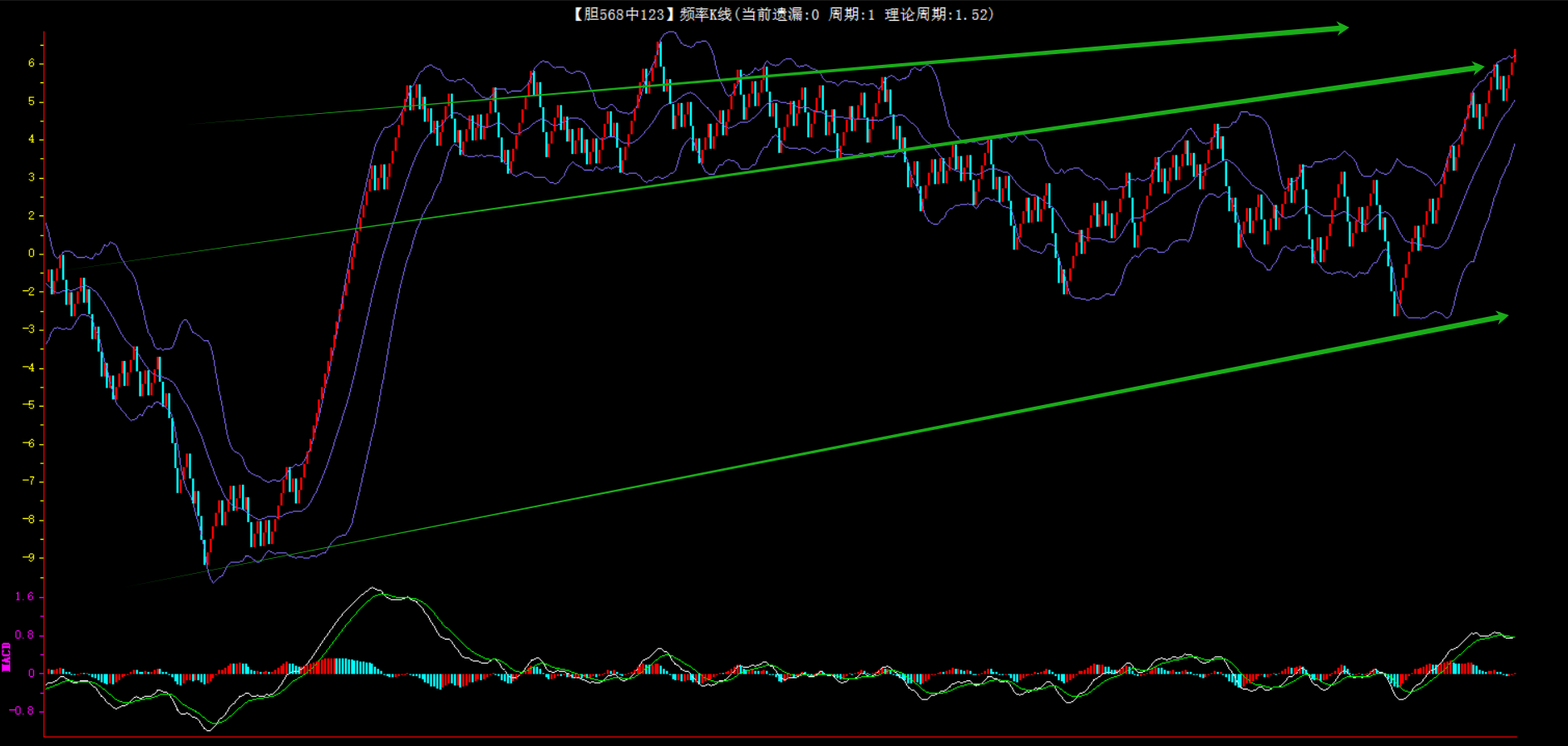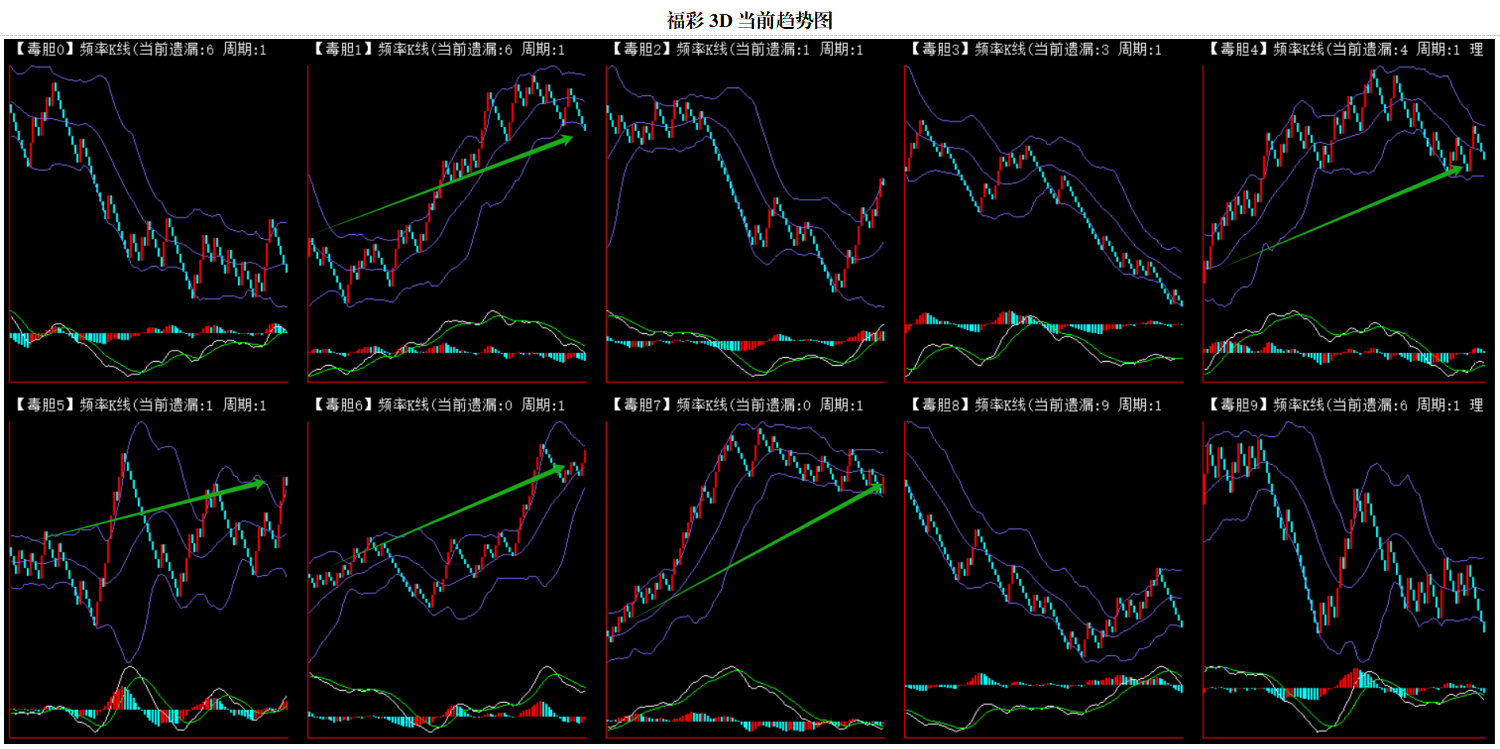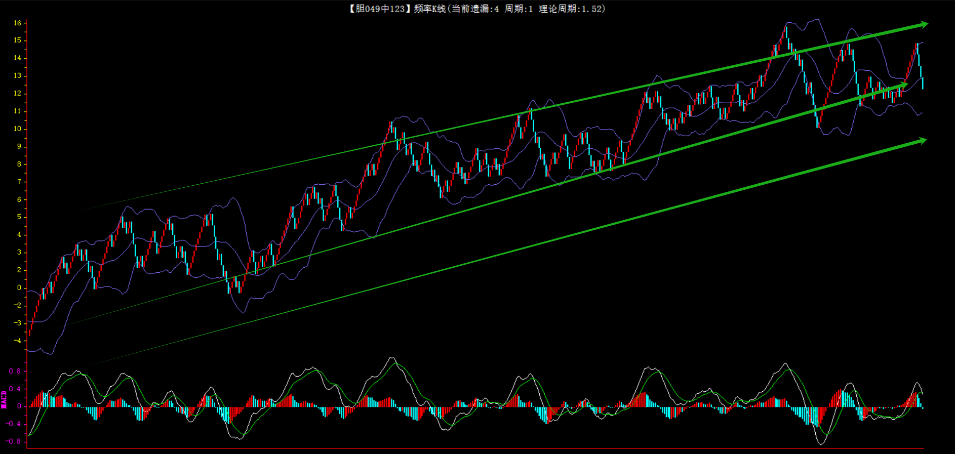 整体趋势上行,上边沿线趋势向上,下边沿趋势也是向上,节点震荡,当前遗漏4期,本期关注。