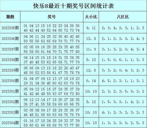 福彩快乐8第2023304期奖号为:01 16 17 18 24 25 29 32 37 39 59 60 61 66 68 69 70 73 77 80,其中奖号大小比为10:10,八区比为1:3:3:3:0:2:5:3。