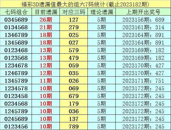 1。截止第23182期,七码组六遗漏最大的是:0345689,当前遗漏26期。