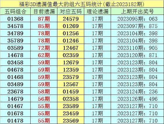 3。福彩3D第23182期10个遗漏最大的五码组六开出0个。