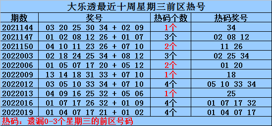 冷号:最近十周星期三前区开出8个冷号,上周星期三冷号出现1个,本周星期三放弃冷号出现的可能。