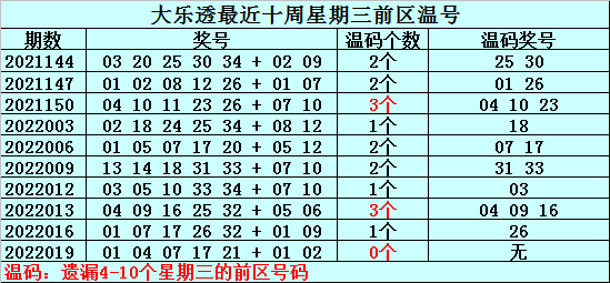 温号:最近十周星期三前区开出17个温号,上周星期三温号全部轮空,本周星期三关注温号12 13。