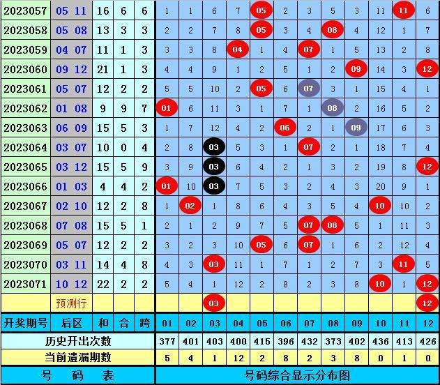 后区分析:上期后区开出三区两码10+12,最近10期后区三区落号比为1:1:0,最近5期后区三区落号比为1:0:1,本期后区号码大范围关注02、03、04、09、12,后区精选两码03、12。