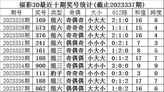 开奖回顾:福彩3D第2023337期奖号为862,奖号形态为:组六、大大小、1:0:2、偶偶偶。