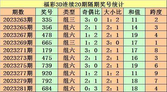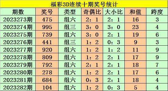 上期回顾:福彩3D第2023282期奖号:104。组六、小小小、奇偶偶。