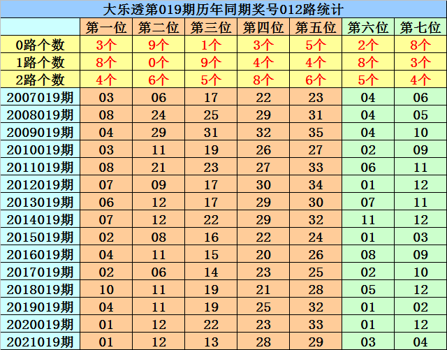 二号球分析:在第019期历史同期开奖中,二号球分布在06-29之间,号码012路比为9:0:6,其中0路号码:12出现4次,06出现2次,09、21、24出现1次;1路号码;2路号码:11出现4次,08、29出现1次,目前1路号码遗漏15年,今年同期排除1路号码,参考0路号码03。