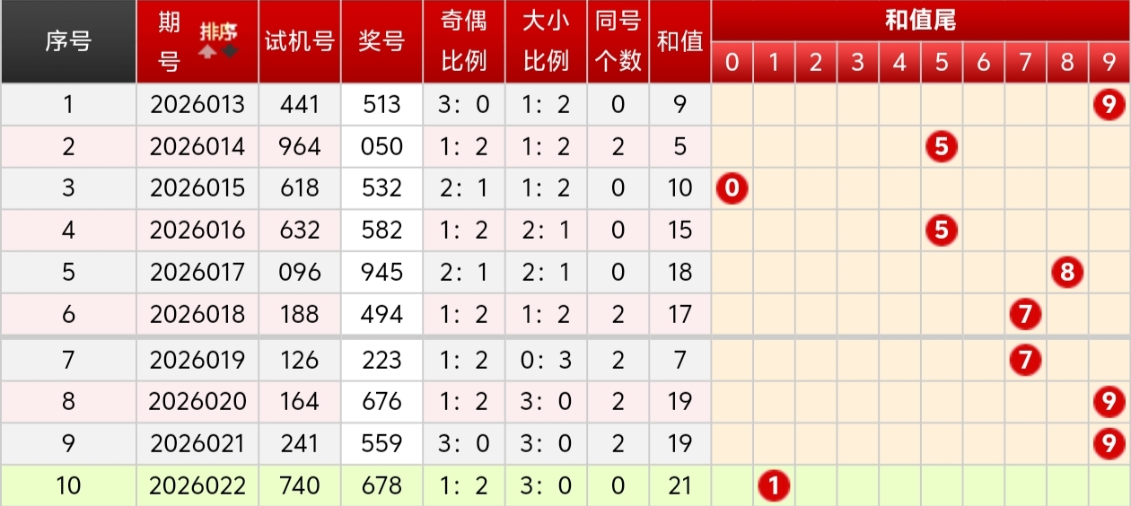 上期福彩3D号码为678,其中奇偶比为1:2,大小比为3:0,同号为0,和值为21。