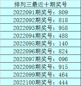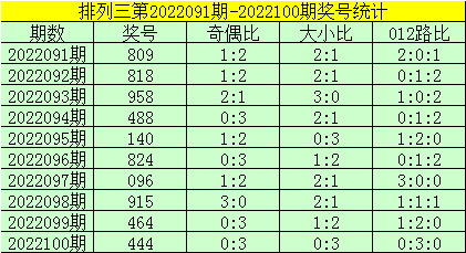 开奖回顾:排列三第2022100期奖号:444,类型:豹子,奇偶比0:3,大小比0:3,和值12,跨度0。
