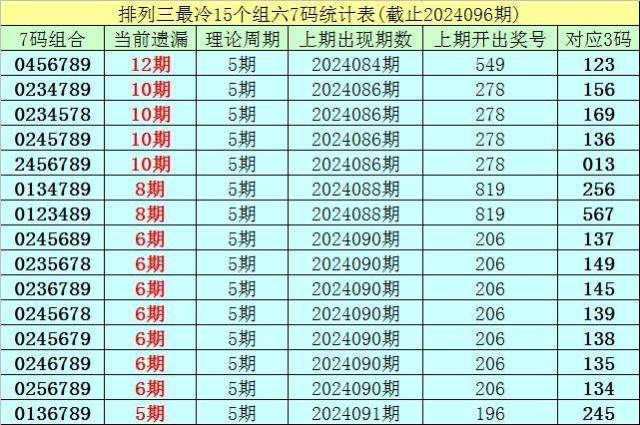 (1)在排列三已开出的6868期奖号中(统计截止第2024096期),目前7码组六遗漏值最大的组合为:0456789,本期遗漏12期;