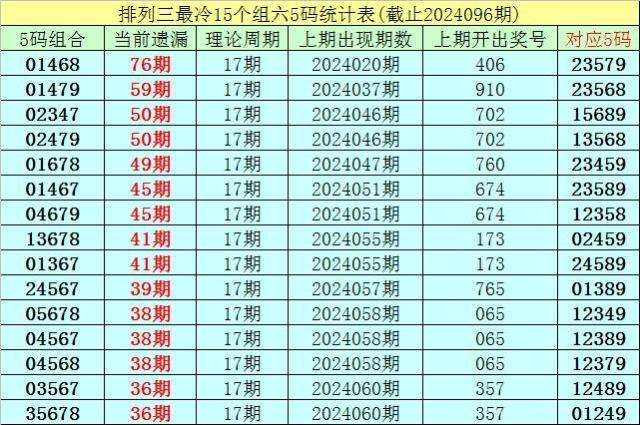 (5)排列三目前遗漏值最大的5码组六组合为:01468,本期遗漏76期,短期解冻的可能性较小,则24097期奖号分布在01468-23579之中的可能性最大。