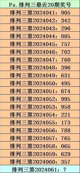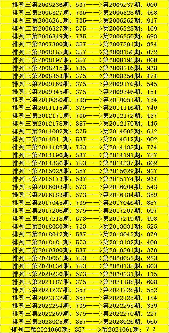 第2024060期排列三奖号为357,历史上该号码直选出现9次,下期奖号分别为:824、072、068、145、927、552、154、665。