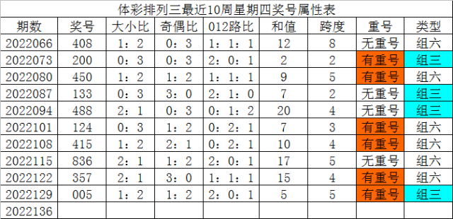 体彩排列三最近10周星期四奖号分别为:408、200、450、133、488、124、415、836、357、005,各奖号属性详见下表: