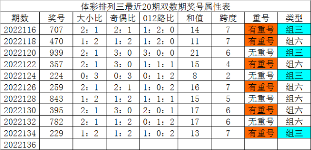 体彩排列三最近20期双数期奖号分别为:707、470、939、357、224、259、843、395、782、229,各期奖号详细属性下表: