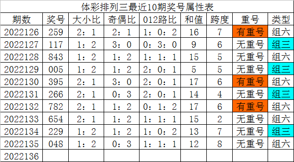 体彩排列三最近10期分别开出奖号:259、117、843、005、395、266、782、654、229、048,各奖号属性详见下表: