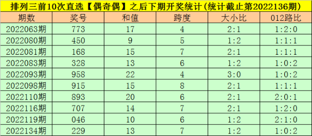 5。下期奖号跨度分别开出:4、5、7、6、4、8、6、7、6、7,其中跨度012路比为3:5:2,大小比8:2,奇偶比为4:6,本期适当关注0路跨度开出,参考跨度3。