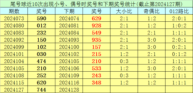 在尾号球前10次开出小号、偶号类型之后,其下期分别开出奖号:629、928、549、935、157、215、210、533、243、348,其中号码奇偶比为7:3,大小比为7:3,012路比为5:1:4。