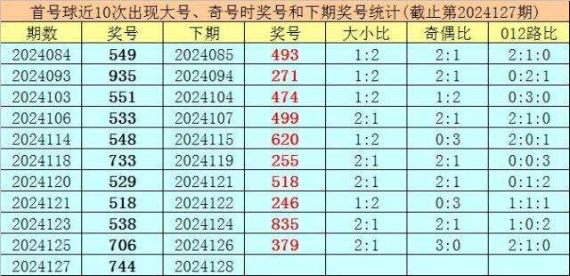 开奖回顾:体彩排列三第2024127期开出奖号744,奖号大小比开出1:2,奇偶比开出1:2,012路比开出0:3:0。
