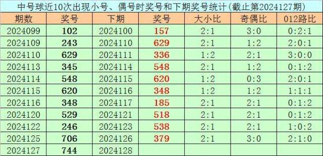 在中号球前10次开出小号、偶号类型之后,其下期分别开出奖号:157、629、336、548、620、348、185、518、538、379,其中号码大小比为3:7,012路比为2:4:4,奇偶比为5:5。