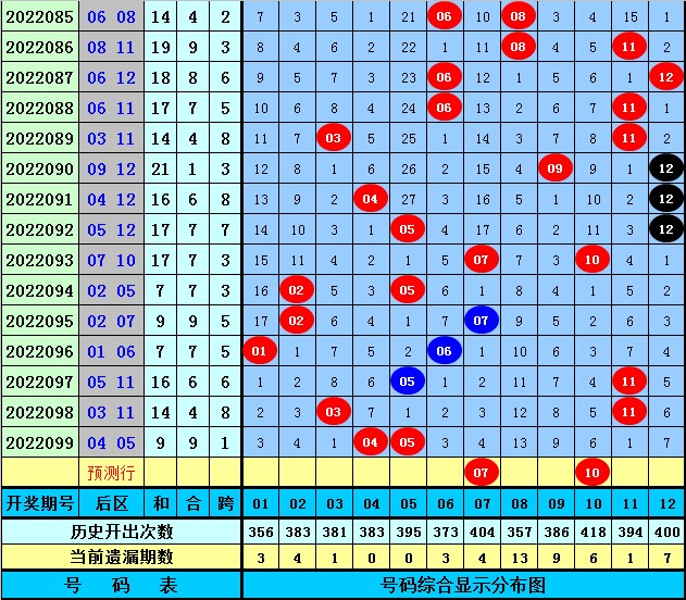 后区分析:上期后区奖号为04+05,遗漏期数为7期+1期。,目前后区热码有6个:01、03、04、05、06、11,后区温码有5个:02、07、09、10、12,后区冷码有1个:08,本期后区看好号码03、04、07、10、11,单挑一注07+10。