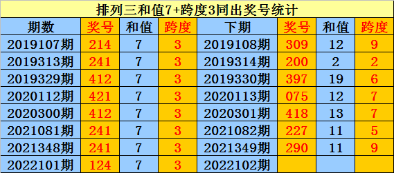 上期回顾:排列三第2022101期奖号:124。和值7,跨度3。