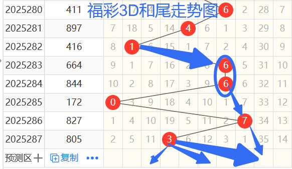 1)我们来看和尾,以283期——287期为例,如图 们依次是66073和尾,按照012路排序是00010路和尾,后面两期不是同路,今天就是0路或1路的和尾,为什么这么讲呢,这个是个大概率的问题,也是根据长期的研究规律定的,准确率相当高,我定了0 1路的和尾,也就是0369147和尾,那么我们再来看和值,按照和值除3余数的话,可以分为余0 1 2路. 那么我们来看283期和值16余1,284期和值16余1,285期和值10余1,286期和值17余2,287期和值13余1,那么本期和值看余2余1,根据上面的和尾那么就只有10 13 16 19 11 14 17 防22 8 18和值