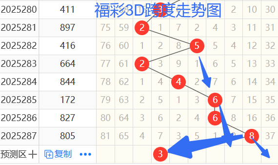 2)我们来看跨度;还是以283期——287期为例,如图 依次是24668跨度,按照路数转换关系来看,那么跨度我们暂定369147跨,本期个人比较看好3 9 7  跨。