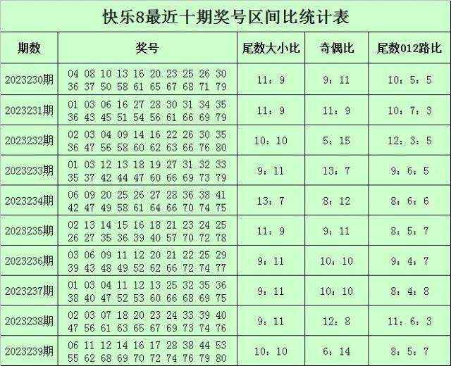 福彩快乐8第2023239期开奖回顾:06 11 12 14 16 17 28 38 44 53 55 62 68 69 70 72 74 76 79 80,其中奖号尾数奇偶比为6:14,尾数大小比为10:10,尾数012路比为8:5:7。
