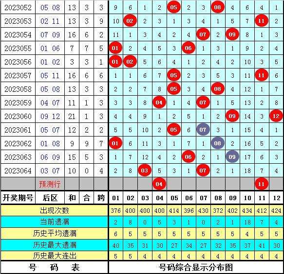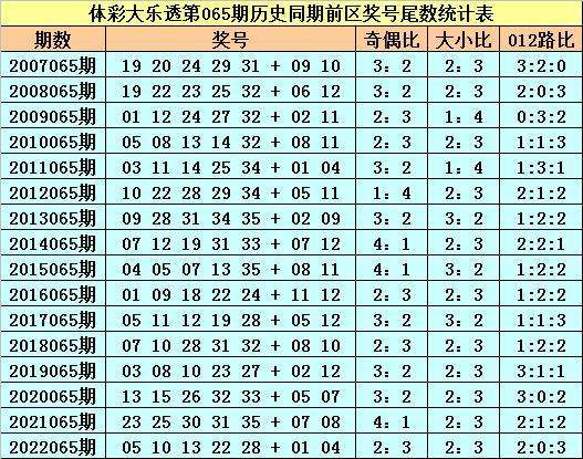 前区尾数频次统计:在第065期历史同期开奖中,前区尾数2开出次数最多,为12次,尾数3、5出现11次,尾数1、4出现9次,尾数8、9出现8次,尾数0出现6次,尾数7出现5次,尾数6出现1次,本期前区奖号必杀一尾:0。