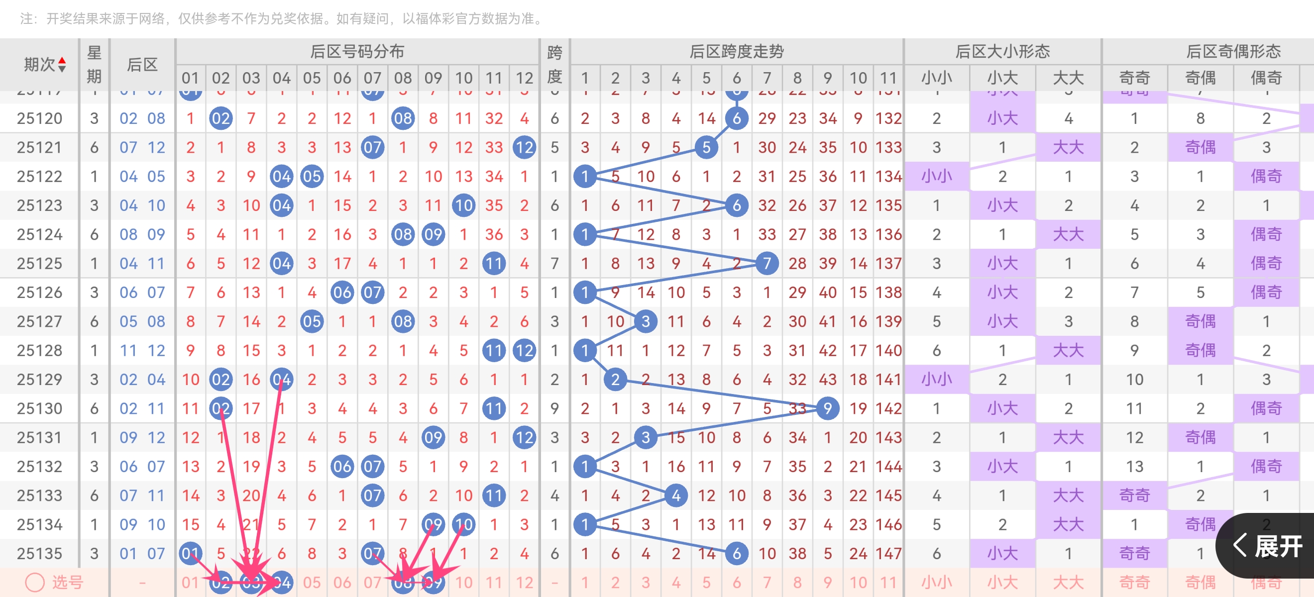 奇偶 :上期全奇组合,本期看 一奇一偶 组合,如 02(偶)+03(奇) 或 08(偶)+09(奇) 。