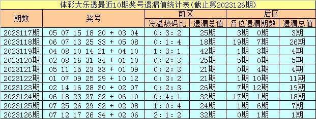 彤彤第2023127期体彩大乐透前区遗漏分析:(定义:前区遗漏0-4期号码为热码,遗漏5-12期号码为温码,遗漏13期及13期以上为冷码)