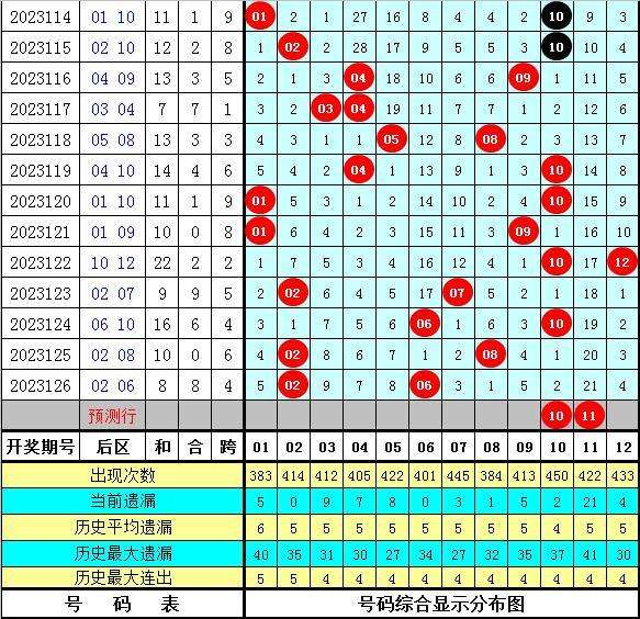 后区奖号分析:上期后区开出奖号02+06,最近100期后区冷温热码个数比为34:68:98,前50期后区冷温热码个数比为16:31:53,最近10期后区冷温热码个数比为4:5:11,目前后区含有冷温热码个数比为1:6:5,本期后区号码大范围参考:04、05、07、10、11,单挑两码10、11。