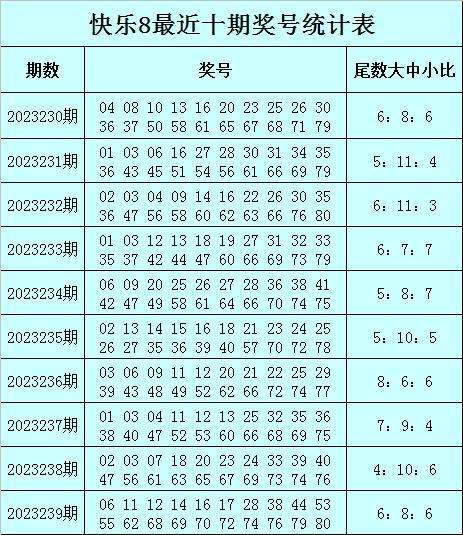 福彩快乐8第2023239期开奖回顾:06 11 12 14 16 17 28 38 44 53 55 62 68 69 70 72 74 76 79 80,其中包含6个小尾奖号:11、12、62、70、72、80;包含8个中尾奖号:06、14、16、44、53、55、74、76;包含6个大尾奖号:17、28、38、68、69、79。