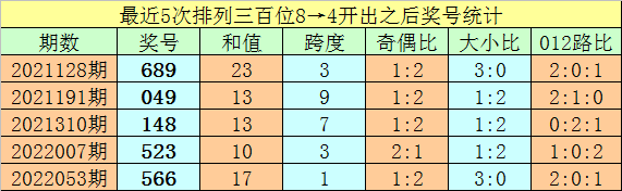 1、排列三最近两期百位号码分别开出8和4,历史上百位号码连续两期分别开出8和4的奖号出现了74期。前五期开出之后其下期奖号分别为:689、049、148、523、566;