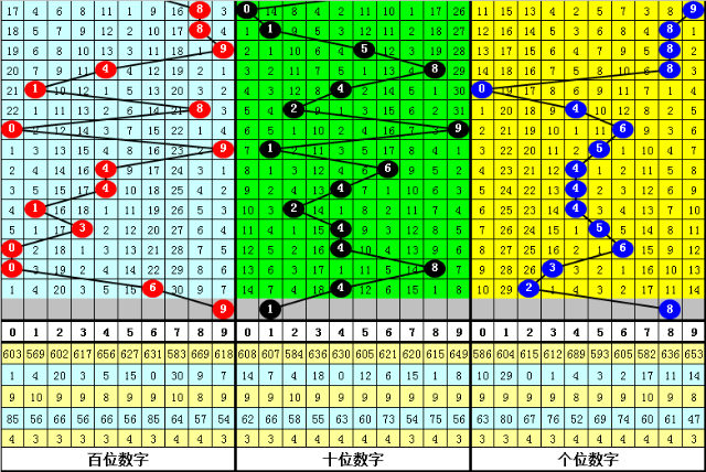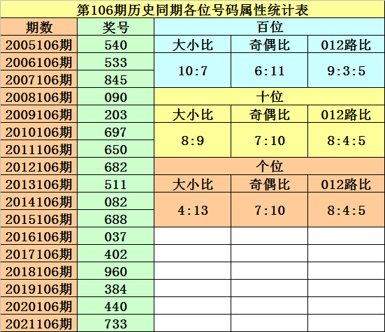第106期历史同期开奖中,百位号码振幅分别为:0-3-8-2-4-0-0-1-5-6-6-4-5-6-1-3,波动范围在0-9之间,012路号码比例开出9:3:5,大小号码比例开出10:7,奇偶号码比例开出6:11,本期注意百位开出0路号码,一码看好9。