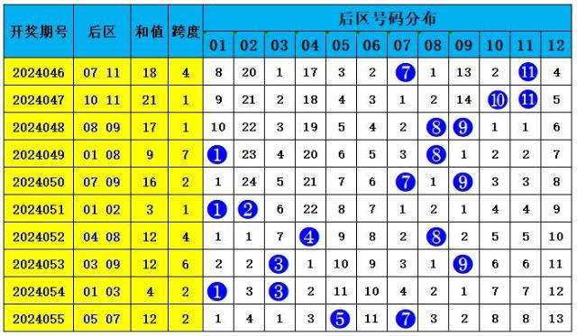 上期回顾:大乐透第2024055期奖号为:前区07、17、22、30、34,后区05、07,前区奖号三区比为1:2:2,奇偶比为2:3,大小比为3:2,后区开出小大组合05、07