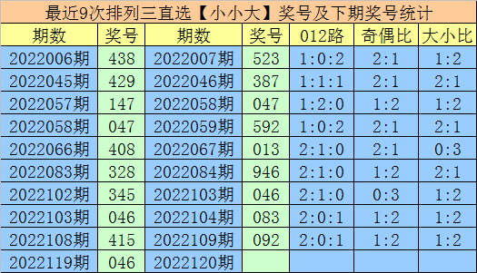 上期回顾:体彩排列三第2022119期开出奖号:046,其012路比为2:1:0,奖号012路类型为:010。