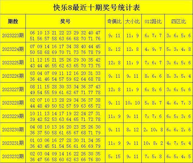 福彩快乐8第2023232期开奖回顾:02 03 04 09 14 16 22 26 30 35 36 47 56 58 60 62 63 66 76 80,其中奖号大小比为9:11,012路比为7:5:8,和值为765,跨度为78,奇偶比为5:15。