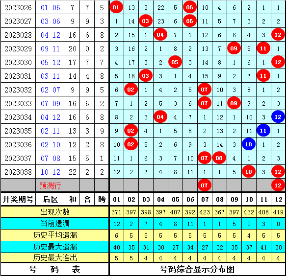 后区号码分析:后区上期开出奖号10和12,历史上前5次号码10与12同时出现之后,其下期分别开出奖号:01+03、01+11、02+12、06+12、01+09,本期后区注意号码04、05、07、11、12,精选两码07、12。