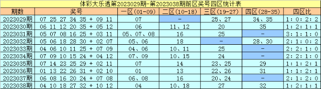 许老六大乐透第2023039期前区四区划分分析(定义:01-09段为一区,10-18段为二区,19-27段为三区,28-35段为四区):
