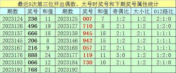 前7次第三位号码开出偶数、大号时奖号分别为:236、496、666、206、216、888、066,其中奇偶总比例为3:18,有3期奇偶比与上期奇偶比相同;号码大小总比例为13:8,有2期奖号大小比与上期大小比相同;