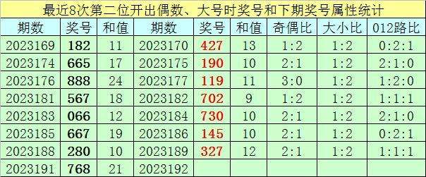 前7次第二位号码开出偶数、大号时奖号分别为:182、665、888、567、066、667、280,其中奇偶总比例为5:16,有3期奇偶比与上期奇偶比相同;号码大小总比例为16:5,有4期奖号大小比与上期大小比相同;