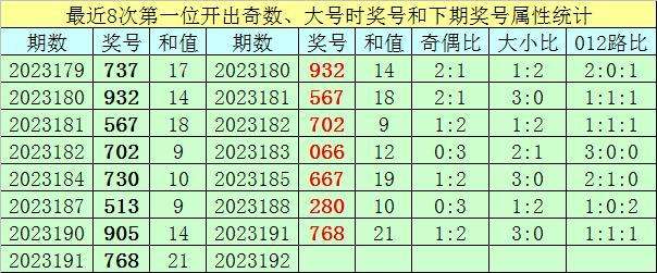 前7次第一位号码开出奇数、大号时奖号分别为:737、932、567、702、730、513、905,其中奇偶总比例为15:6,有1期奇偶比与上期奇偶比相同;号码大小总比例为11:10,有1期奖号大小比与上期大小比相同;